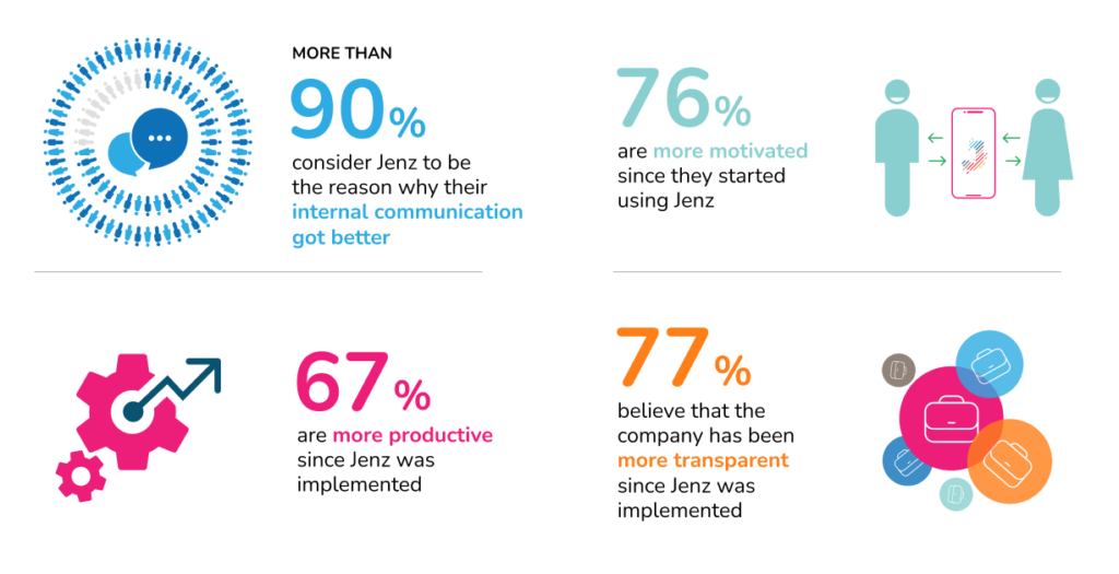 In this infographic, you can see the industry leaders’ results after implementing Jenz as their employee engagement tool. Check out our success stories if you’d like to look deeper into our client’s stats.